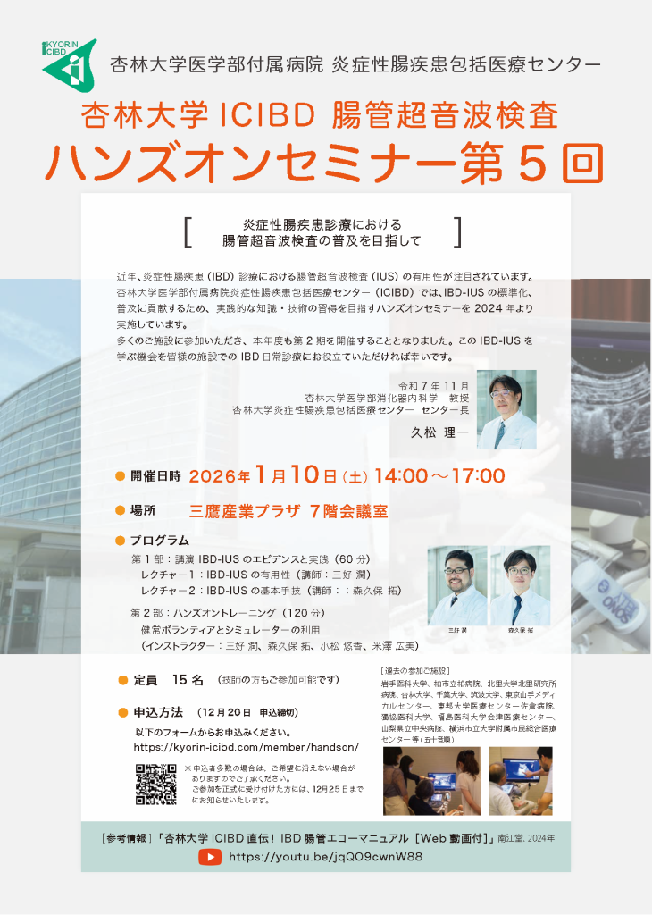 | プログラム | 第1部:講演 IBD-IUS のエビデンスと実践(60 分) レクチャー1:IBD-IUS の有用性(講師:三好 潤) レクチャー2:IBD-IUS の基本手技(講師::森久保 拓) 第2部:ハンズオントレーニング(120 分) 健常ボランティアとシミュレーターの利用 (インストラクター:三好 潤、森久保 拓、小松 悠香、米澤 広美) |